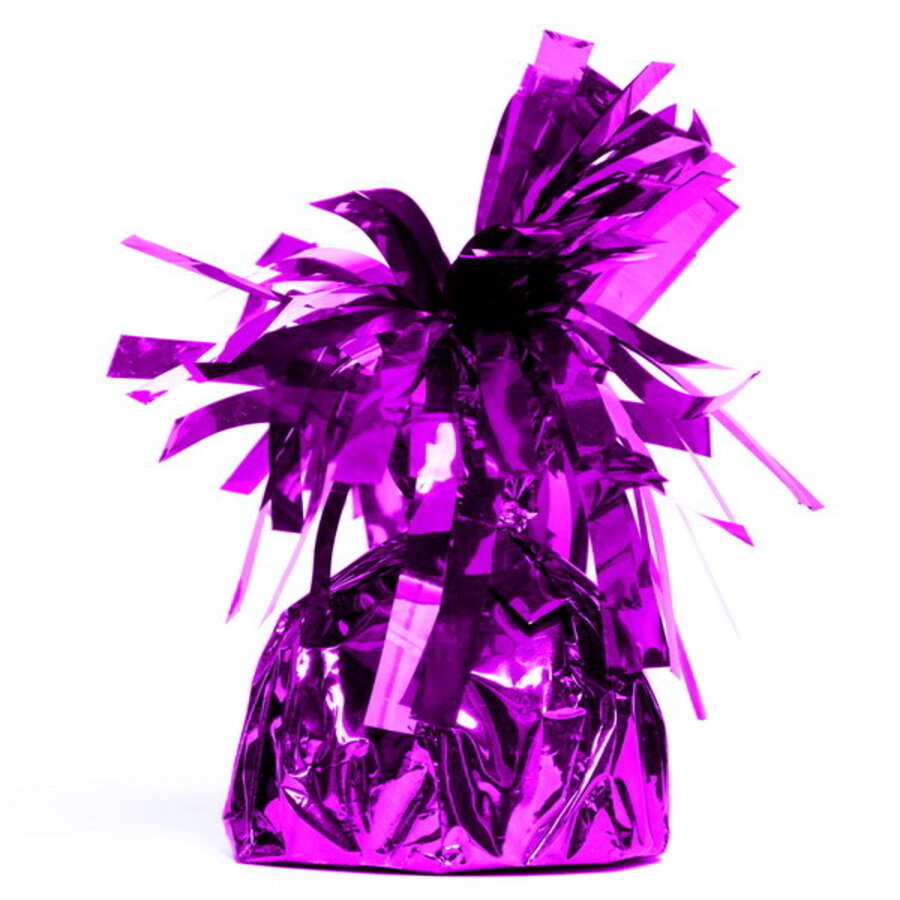 Een paars ballongewicht om onderaan een tros heliumballonnen te knopen. De ballonnen vliegen dan niet weg.