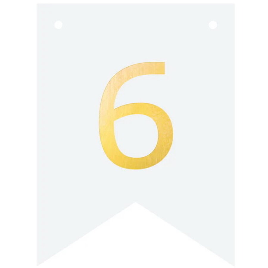 Een witte kaart met daarop het cijfer 6 in een chique goudkleurige bedrukking. In de kaart zitten twee gaatjes waar u lint doorheen kunt halen om de slinger op te hangen. Perfect om zelf een gepersonaliseerde tekst of naamslinger te maken. Ideaal voor verjaardagen, bruiloften, themafeesten, pensioen party's, openingen van winkels en nog veel meer.