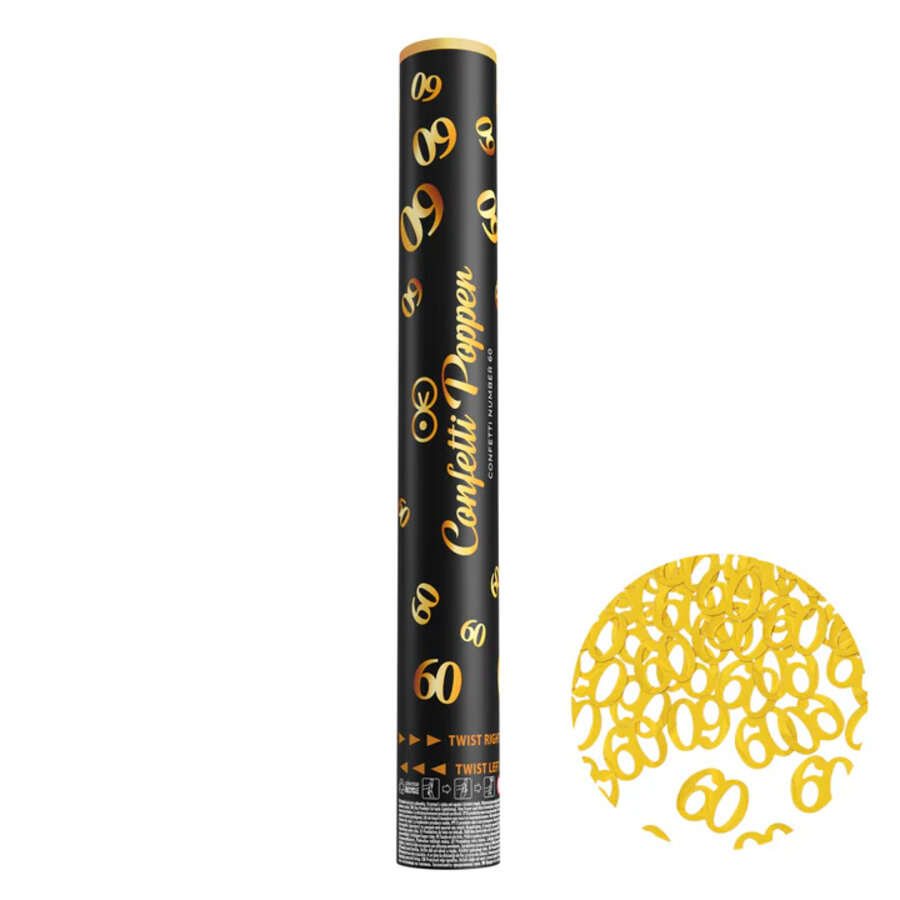 Een Party Popper met cijfertjes 60. Lengte: 40cm. Draai onderaan deze popper en BOEM, er knalt confetti uit in de vorm van kleine cijfertjes 60.