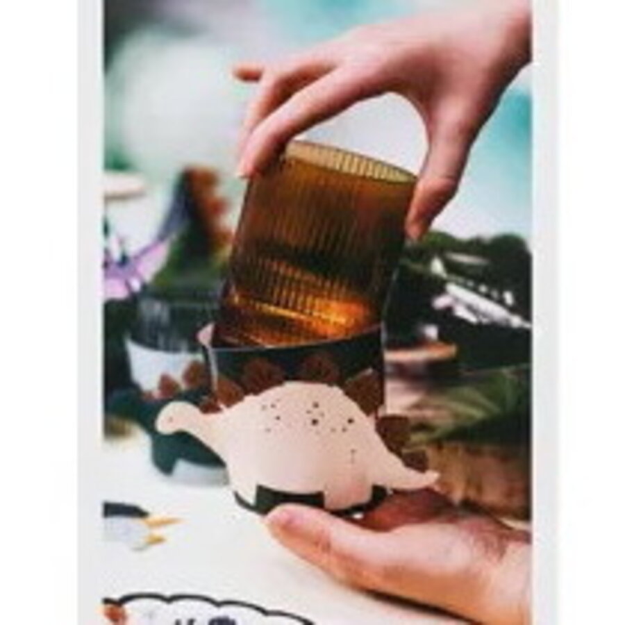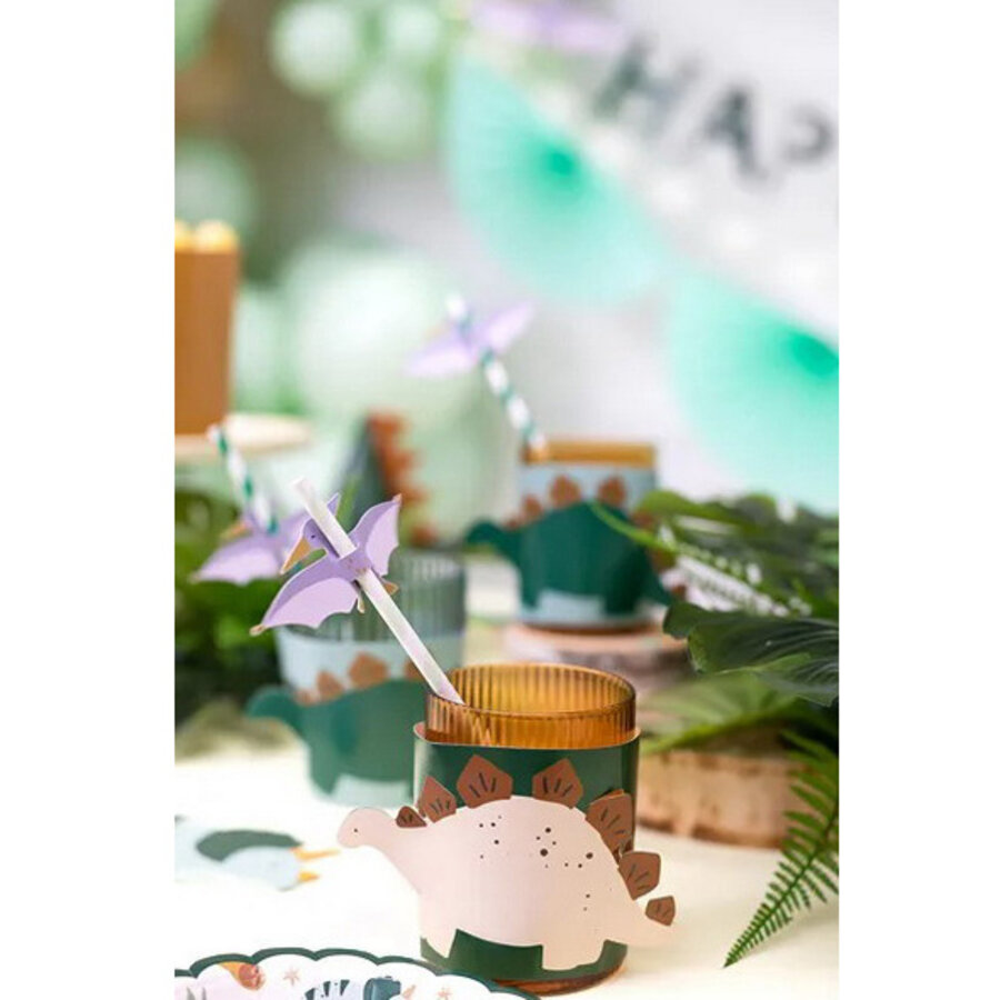 Een pakje met 6 kartonnen wikkels in de vorm van een dinosaurus die je om een glas of beker kunt vouwen. Super origineel! Leuk voor een Dinosaurus verjaardag.