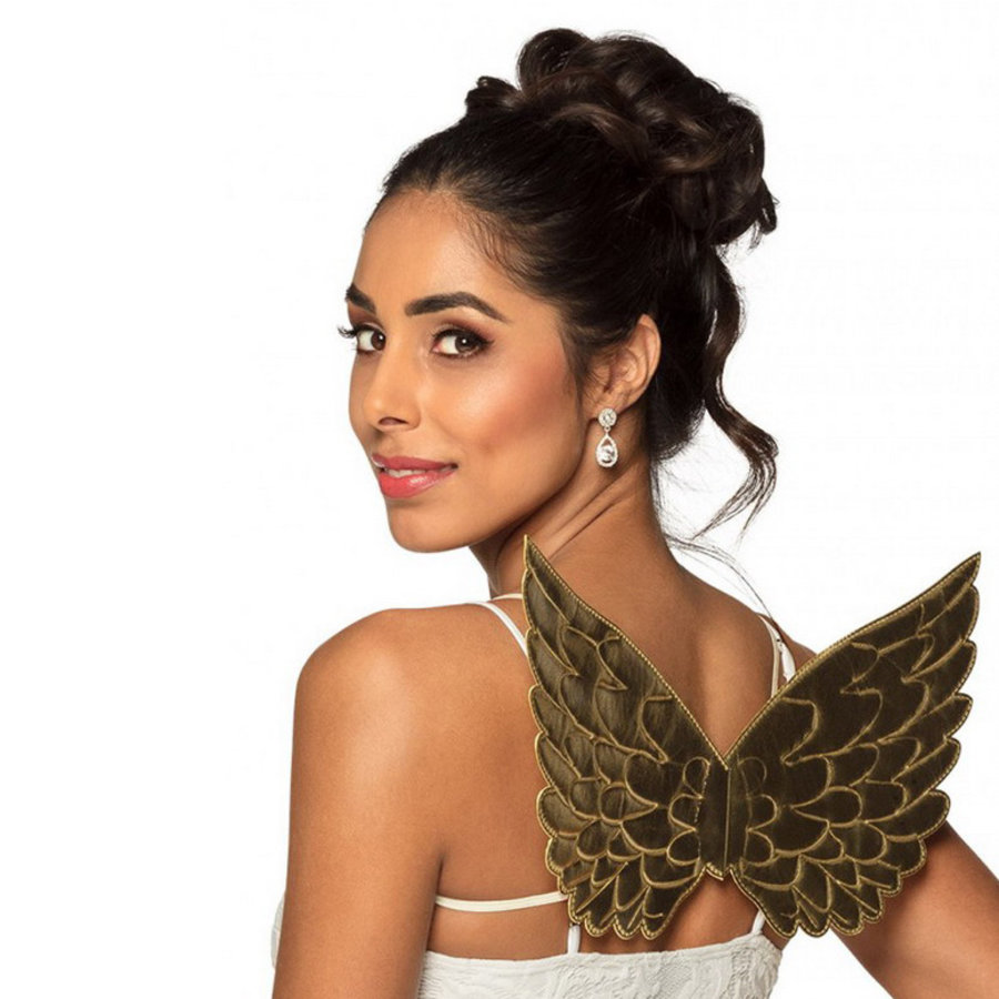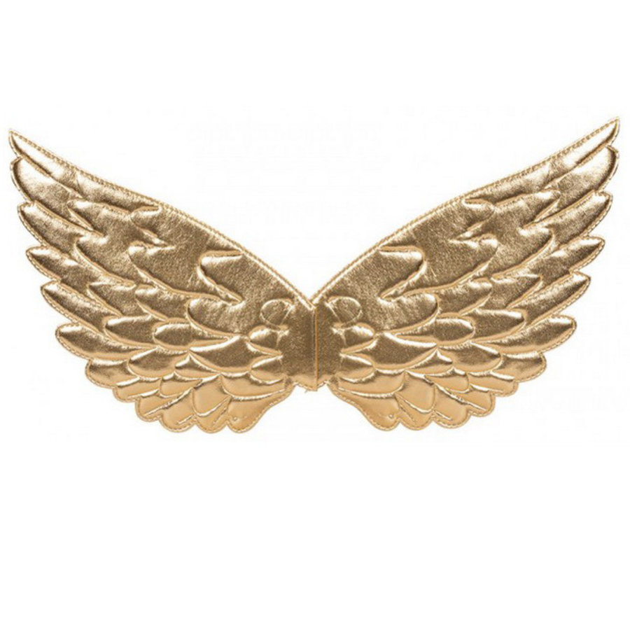 Prachtige goudkleurige stoffen engelenvleugels. Deze engelenvleugels zijn voor kinderen en volwassenen. Door middel van twee brede elastieken om de armen worden de vleugels op de rug bevestigd. De afmeting van de vleugels is 22cm x 43cm.