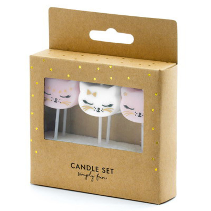 Een pakje met 2 roze en 4 witte kaarsjes in de vorm van kattenkoppen. Erg leuk voor een kinderverjaardag in het thema katten. Afmeting kaarsje: 2cm.
