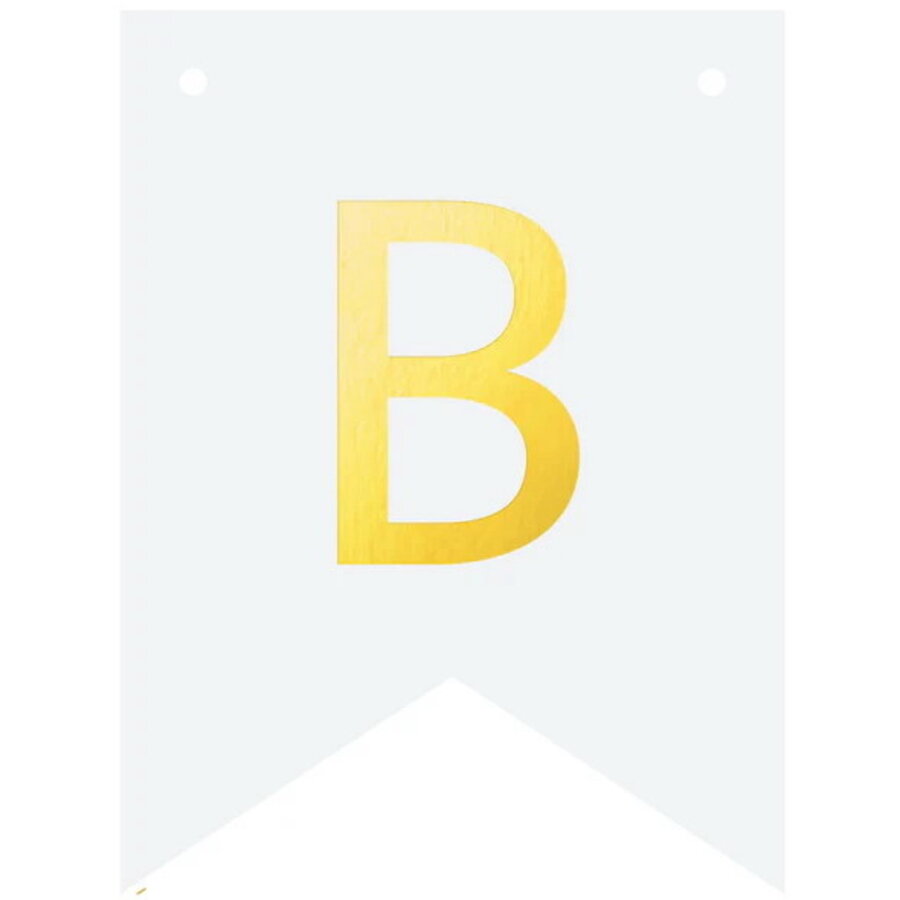 Een witte kaart met daarop de letter B in een chique goudkleurige bedrukking. In de kaart zitten twee gaatjes waar u lint (niet inbegrepen) doorheen kunt halen om de slinger op te hangen. Perfect om zelf een gepersonaliseerde tekst of naamslinger te maken. Ideaal voor verjaardagen, bruiloften, themafeesten, pensioen party's, openingen van winkels en nog veel meer.