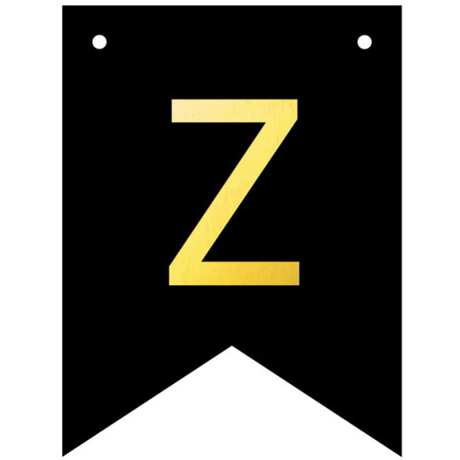 Een zwarte kaart met daarop de letter Z in een chique goudkleurige bedrukking. In de kaart zitten twee gaatjes waar u lint (niet inbegrepen) doorheen kunt halen om de slinger op te hangen. Perfect om zelf een gepersonaliseerde tekst of naamslinger te maken. Ideaal voor verjaardagen, bruiloften, themafeesten, pensioen party's, openingen van winkels en nog veel meer.