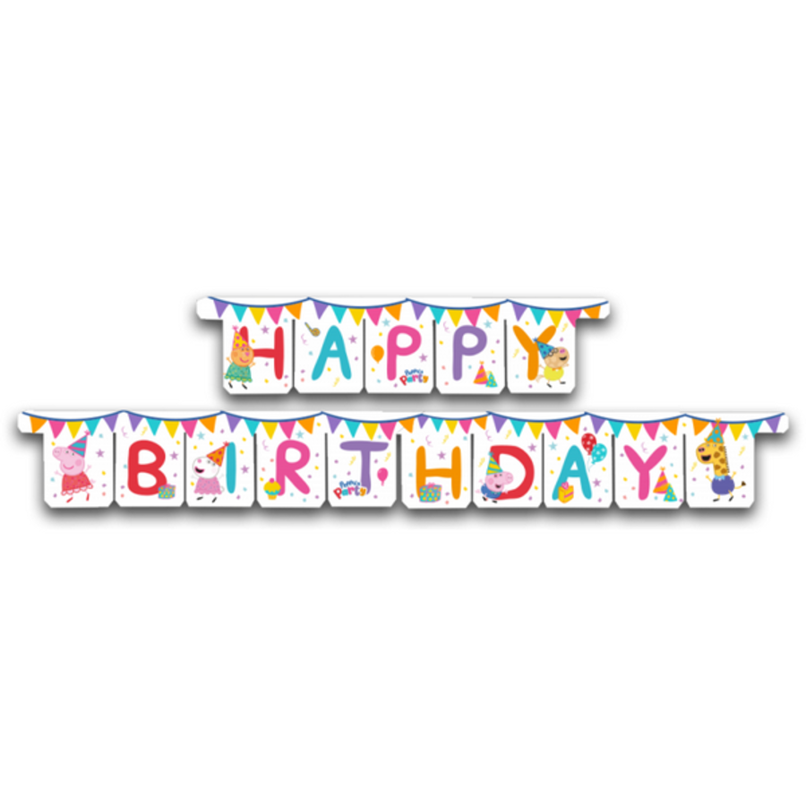 Een mooie kartonnen letterslinger bedrukt met de tekst Happy Birthday en Peppa, George en hun vriendjes. Lengte: 3 meter. Super leuke slinger voor een kinderverjaardag in dit thema.