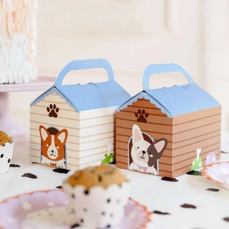 Een pak met 6 lunch boxen in de vorm van een hondenhok bedrukt met hondjes. Erg leuk voor kinderverjaardag in het thema honden. Afmeting: 15.5cm x 10cm x 16cm.