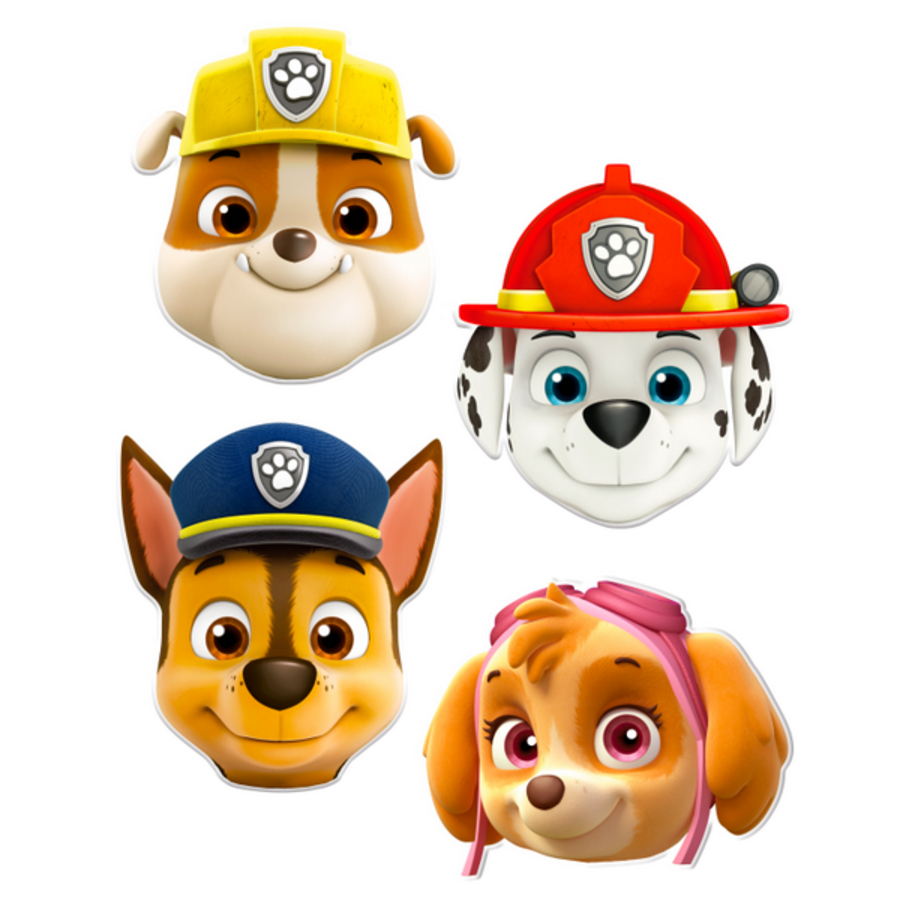 Zes kartonnen maskers bedrukt met 6 helden uit de populaire serie Paw Patrol. Afmetingen: 15cm tot 20cm.