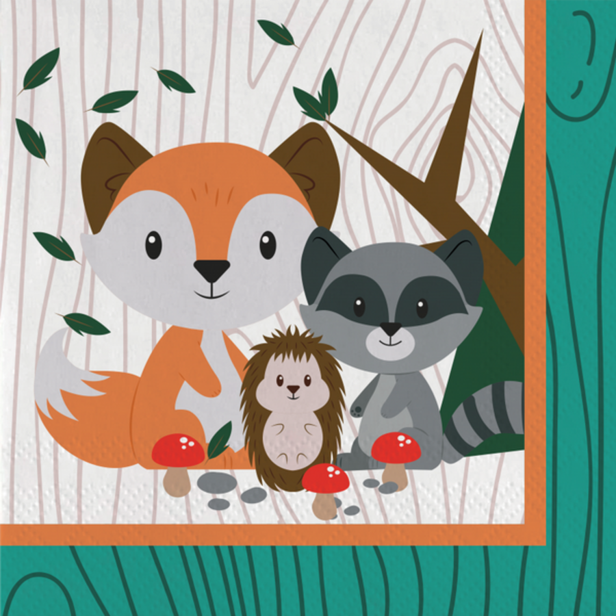 Een pakje met 20 servetten bedrukt met bosdieren. Afmeting: 33cm x 33cm.