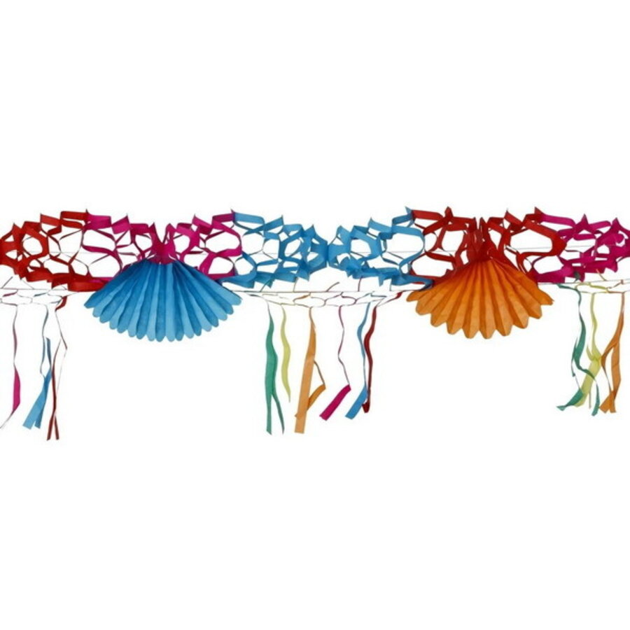 Een vrolijke papieren huiskamer slinger met franje voor een verjaardag. Lengte: 4 meter.