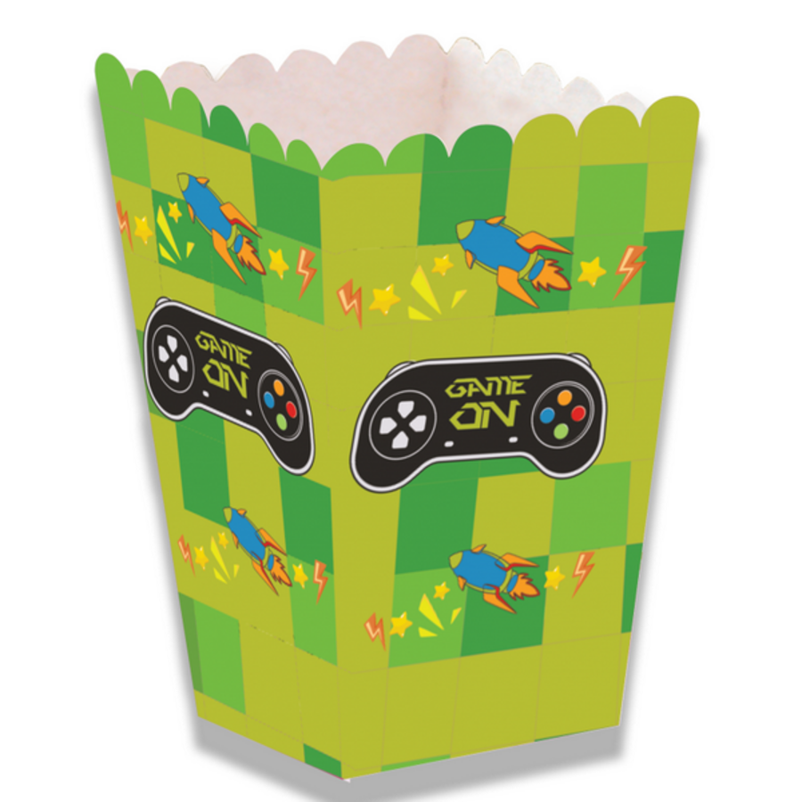 Een pakje met 12 kartonnen snackbakjes bedrukt met game figuren. Afmeting: 12cm x 5cm x 5cm. Leuk om snacks of chips in te doen tijdens een kinderverjaardag in het thema Minecraft of andere games.