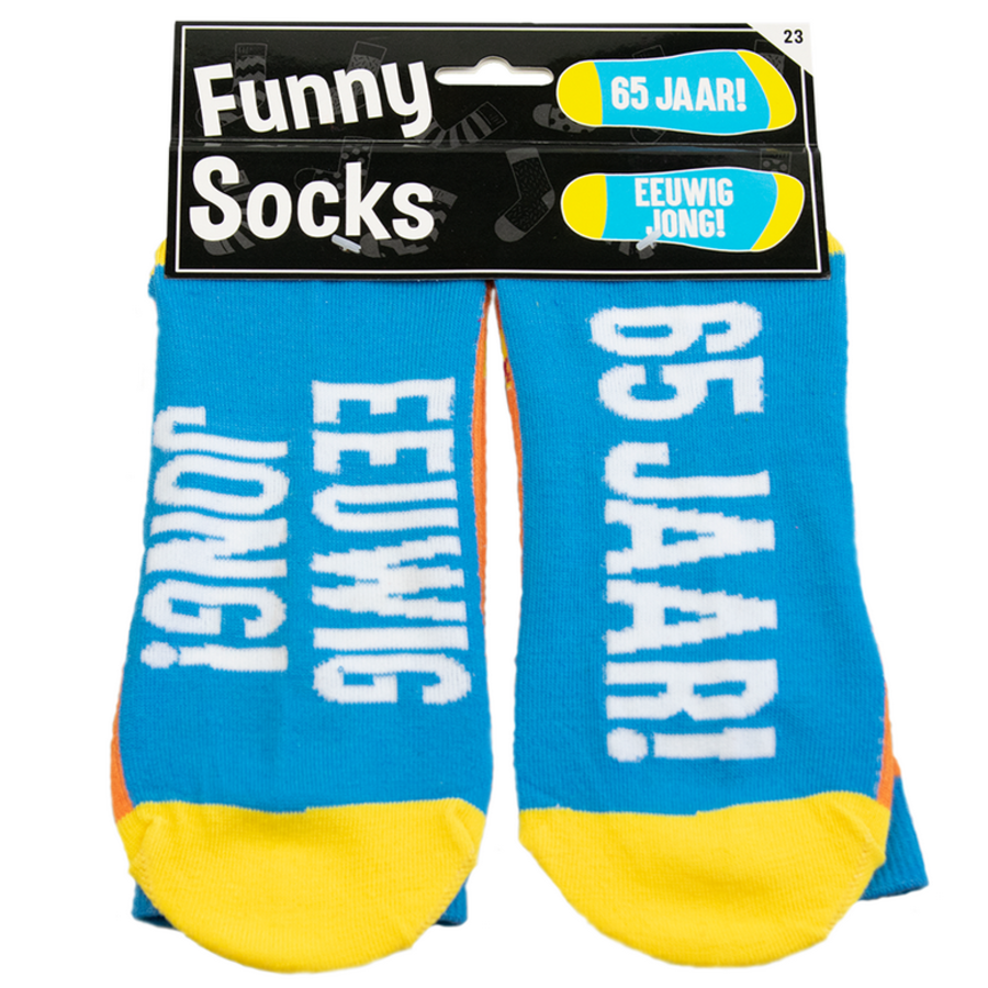 Een paar sokken voor iemand die 65 jaar is geworden. Onderop de 'zool' van de sokken staat op de ene sok de tekst: 65 jaar! en op de andere sok de tekst: Eeuwig jong!. Leuk funkado voor de kersverse 65 jarige.