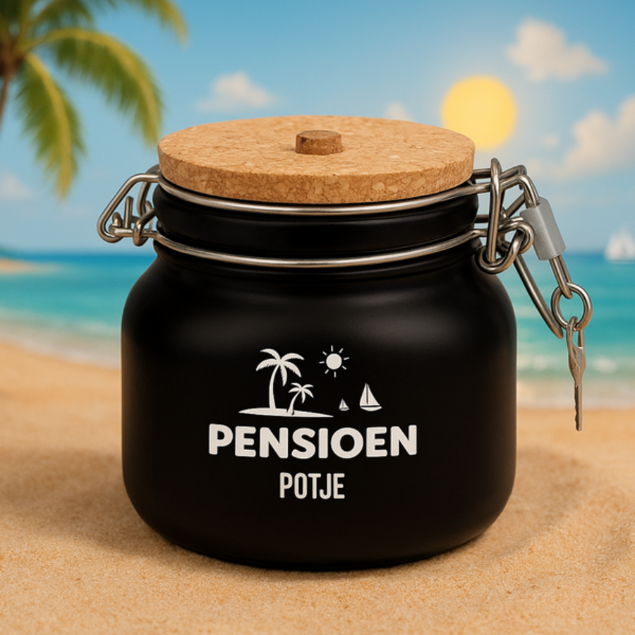 Een grote spaarpot voor iemand die met pensioen gaat. Afmeting: 12cm x 11cm.