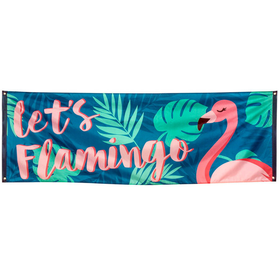 Een groot spandoek bedrukt met een flamingo en palmbladeren. Perfect voor tropische themafeesten. Afmeting: 220cm x 74cm.