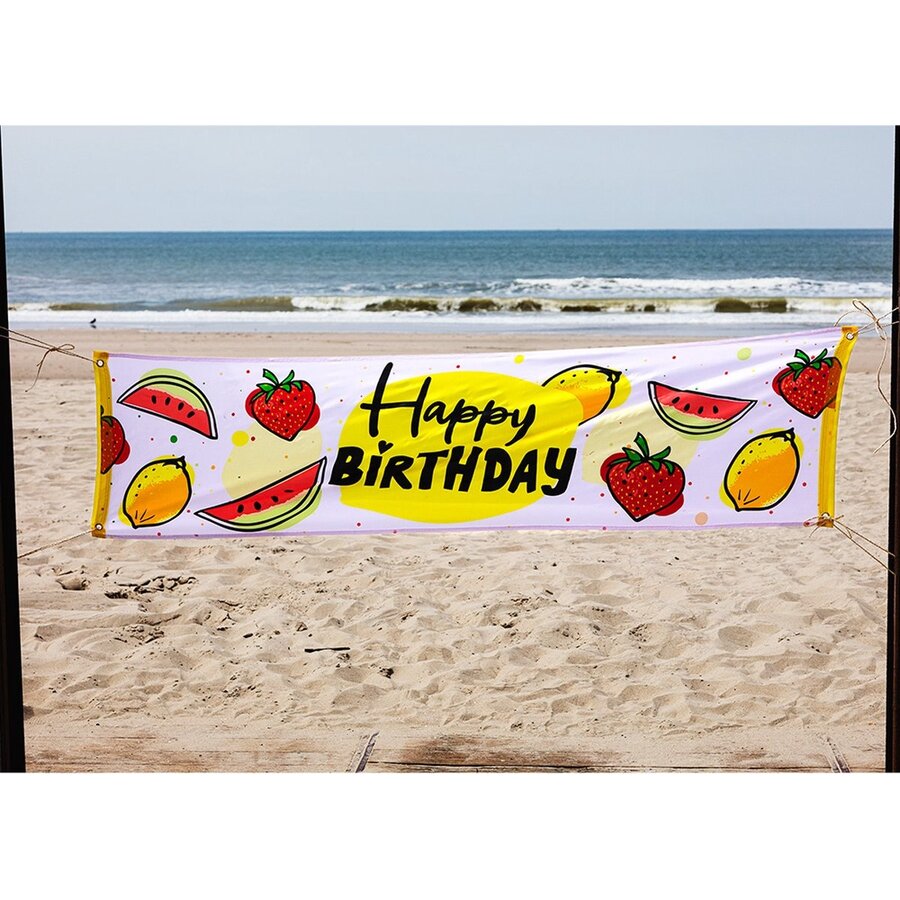Een spandoek bedrukt met fruit en de tekst: Happy Birthday. Afmeting: 180cm x 50cm.