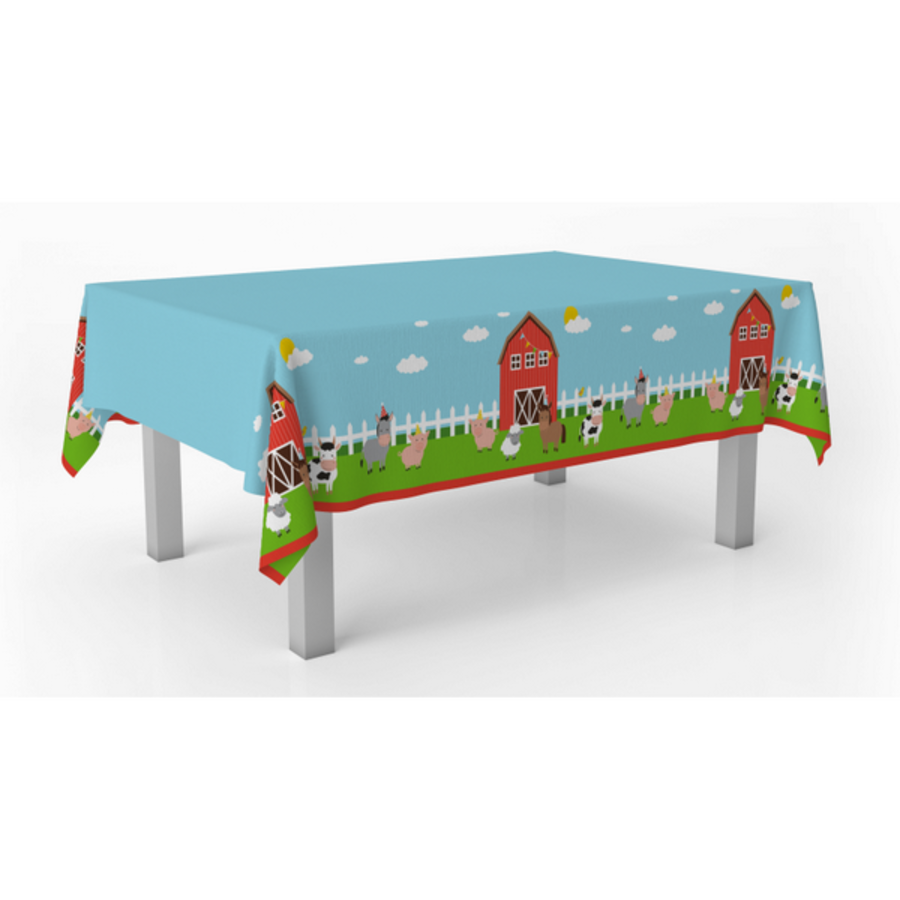 Een plastic tafelkleed bedrukt met boerderij dieren. Afmeting: 120cm x 180cm. Leuk voor een kinderverjaardag in het thema boerderij.