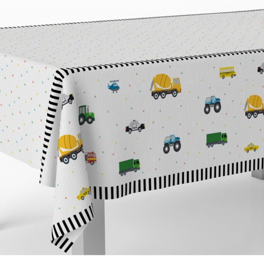 Een plastic tafelkleed bedrukt met verschillende voertuigen. Leuk voor een kinderverjaardag in het thema verkeer of wegwerkers. Afmeting: 120cm x 180cm.