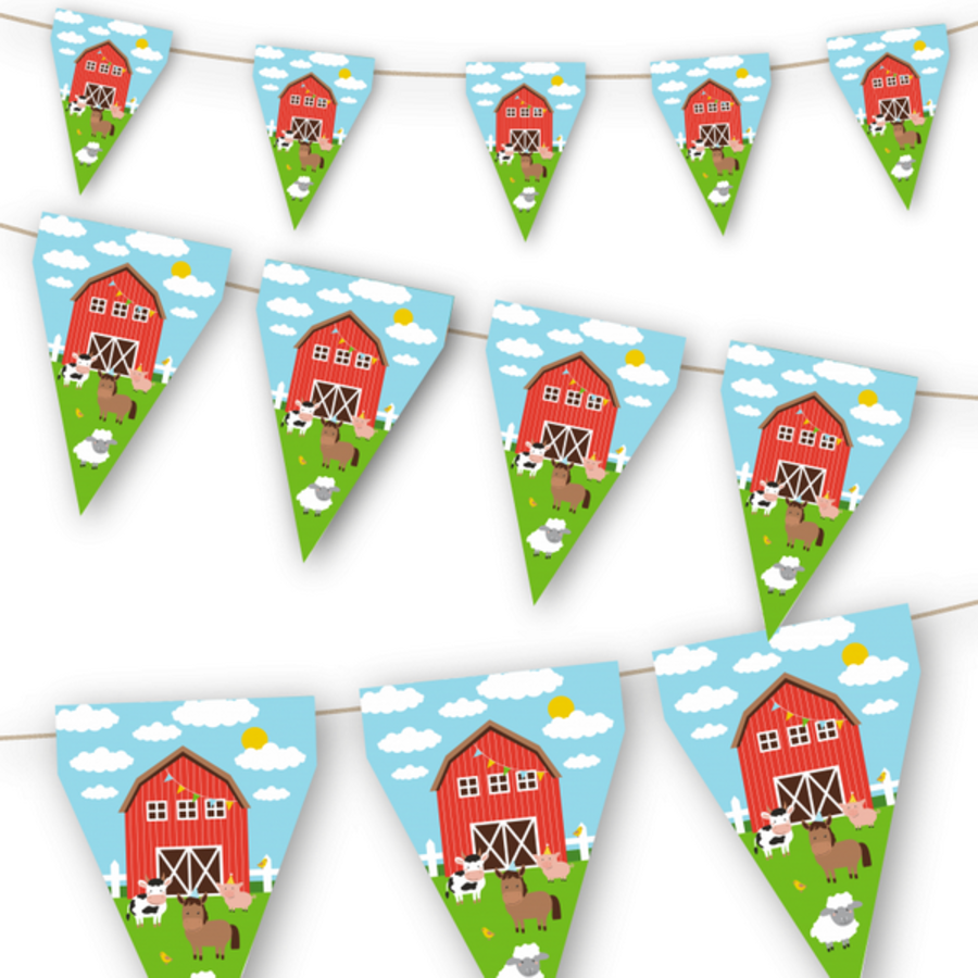 Een vlaggenlijn bedrukt met leuke boerderij dieren. Lengte: 3 meter. Dubbelzijdig bedrukt. Leuk voor een kinderverjaardag in het thema boerderij.