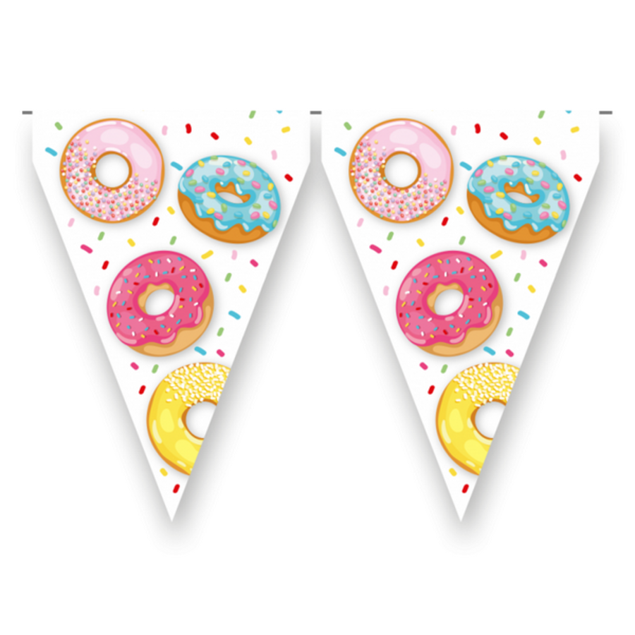 Een superleuke papieren vlaggenlijn bedrukt met donuts. Lengte: 3 meter. Afmeting vlaggetjes: 27cm x 17cm. Leuk en feestelijk voor een (kinder)verjaardag.