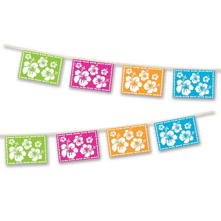 Een rechthoekige vlaggenlijn bedrukt met prachtige tropische Hibiscus bloemen. Verhoogt gelijk de sfeer. Perfect voor tropische Hawaii, zomer en beach themafeesten. Lengte 3.66 meter. Enkelzijdig bedrukt.