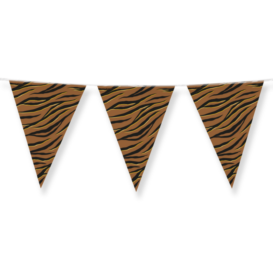 Een prachtige luxe folie vlaggenlijn bedrukt met een tijgerprint. Deze vlaggenlijn is aan beide zijden bedrukt. Lengte 10 meter. Perfect voor tropische feesten of jungle en safari party's.