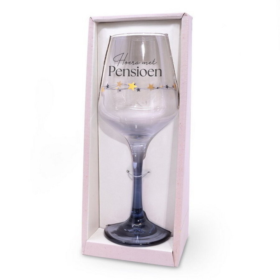 Een prachtig luxe wijnglas voor iemand die met pensioen gaat. Tekst op het glas: Hoera met pensioen. Prachtig origineel cadeau! Afwas advies: met de hand afwassen.